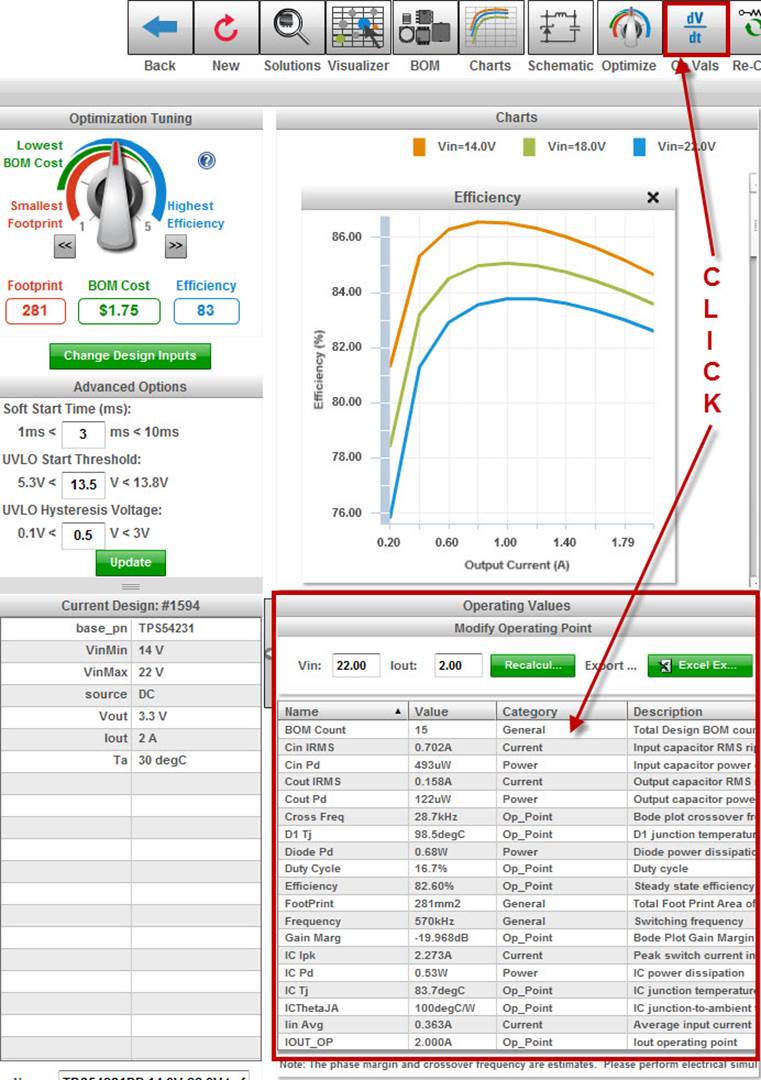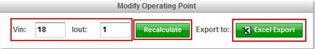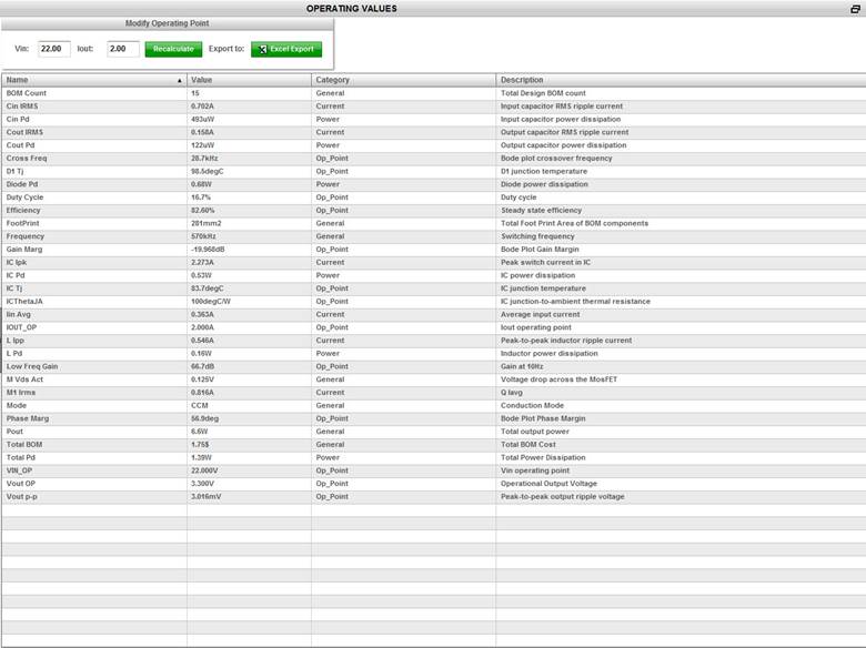 The operating values of the design are stored in your documentation report, however, you may also export the table to Excel. Simply click on the Excel Export green button. Another capability is to change the operating point and regenerate the operating values based on these changes. You can enter your new Vin value or Iout value and click on the Recalculate green button.